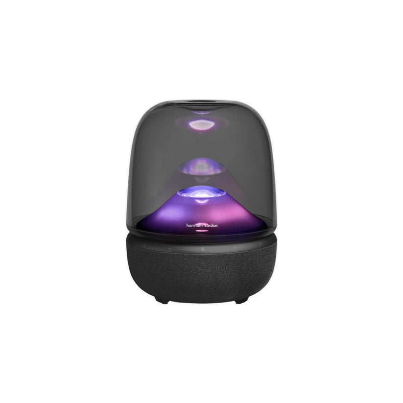 The Harman Kardon Aura Studio 5 delivers 360-degree sound with deep bass and clear highs paired with a transparent dome that features ambient lighting which enhances listening experience.